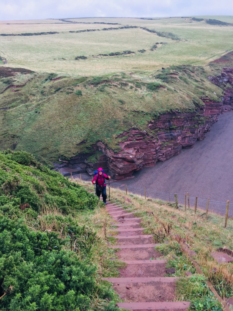 We experienced the steepest climbs on the route during this stage and worse, the steepest descents. We were thanking our lucky stars it wasn’t raining as the steep stone stairs that dominated this stage would have been treacherous and for some terrifying. Our friends the Canadian sisters had warned Heidi about climbing the Wain Stones so she took a lower route but my new friend Irene and I picked our way up through the sheer face following little paths in between and scrambling through some sections. It was worth it, the views allowed us to see in all directions, including views of our destination, the North Sea.
