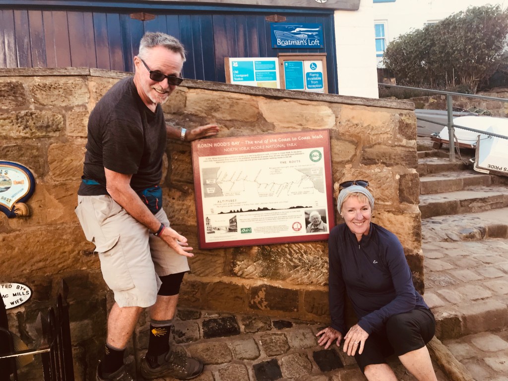 We were tantalized along the way with views of the North Sea, and as we came closer, clear views of Whitby Abby on the top of the cliffs. We visited the Abby (the inspiration for Bram Stoker’s Dracula’s Castle) with the girls six years earlier so old memories flooded back for me. We finally reached the cliffs hugging the east coast and this served as the final runway into Robin Hood’s Bay and the completion of our journey. We both dipped our toes in the North Sea and deposited our rocks to fulfil the pledge C2C walkers make in St Bees. We then joined the fellow walkers we had shared the trail with to celebrate our accomplishments and swap stories of the last day over beers.
