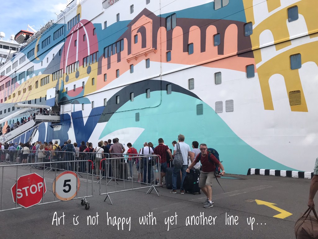First let me describe the boat trip: the ship itself was an old and tired cruise ship staffed by indifferent and unhelpful staff. Everything cost extra and the 2 restaurants were exorbitantly expensive, and you were forbidden to bring any food or drink or even snacks (well we did anyway!). But the horrendous part was the embarkation and disembarkation: there was complete lack of any organization to facilitate thousands of passengers leaving the ship and going through passport control. It took us 3 1/2 hours upon our arrival in St Petersburg- effectively a loss of a half day!