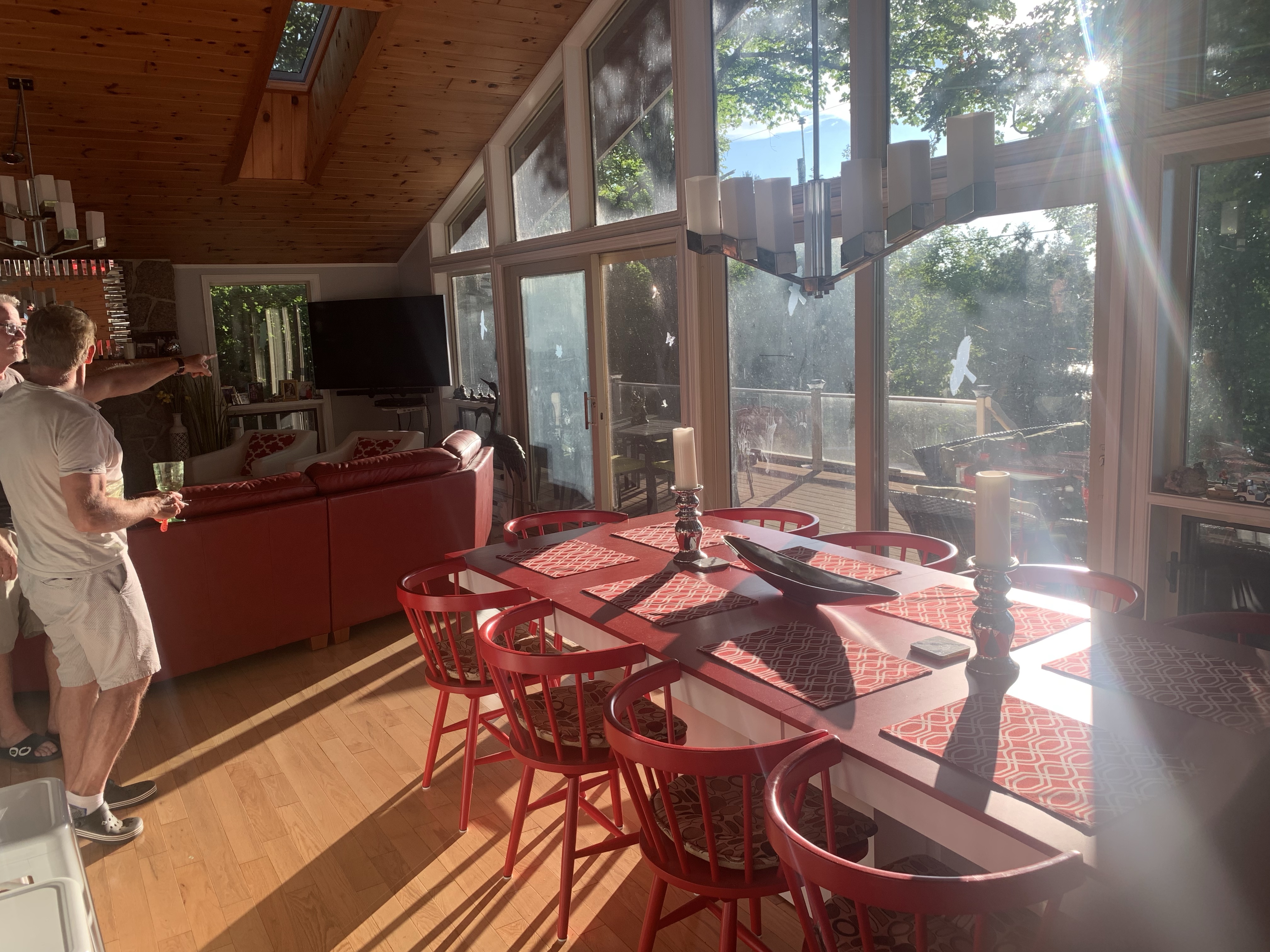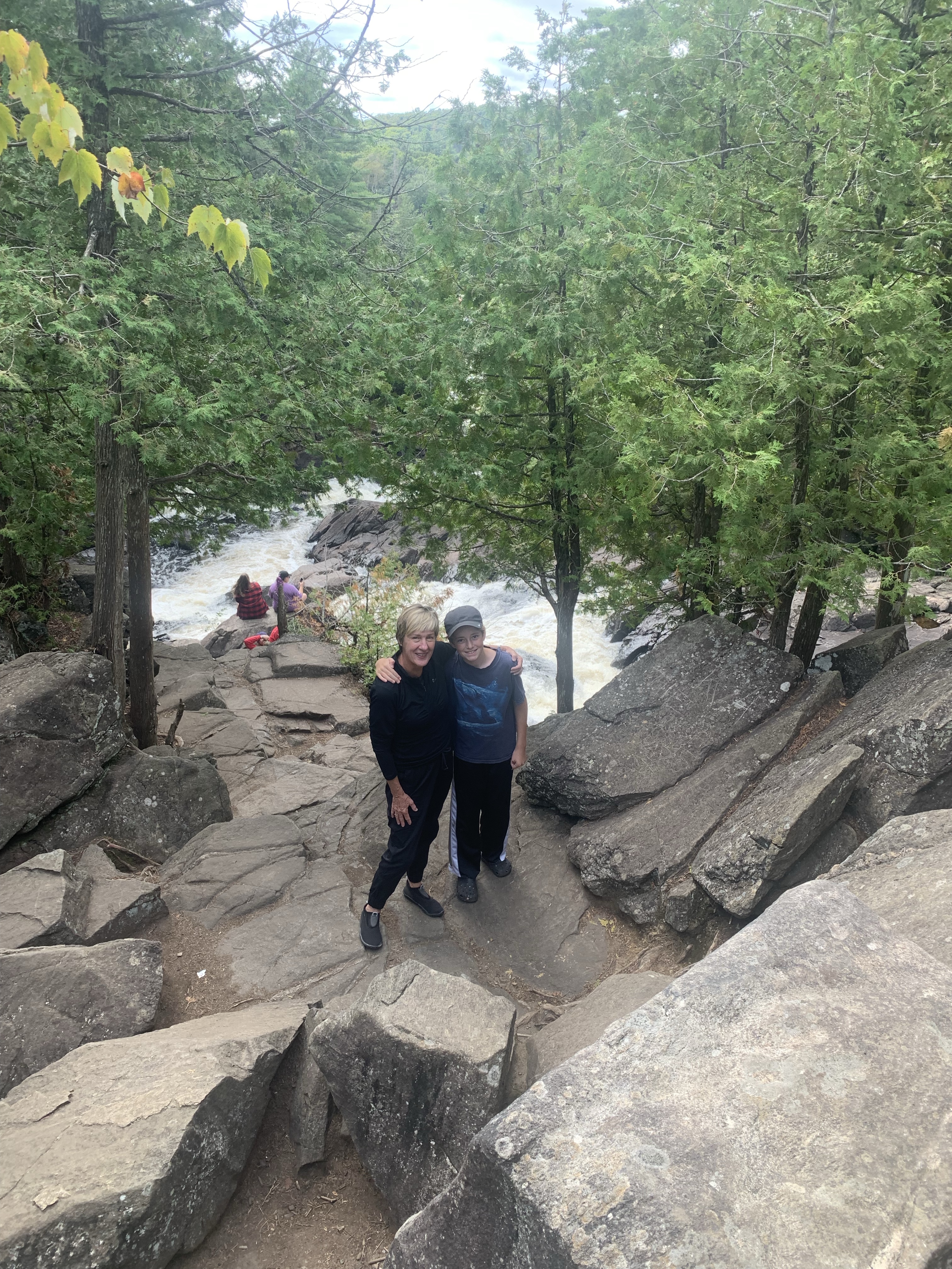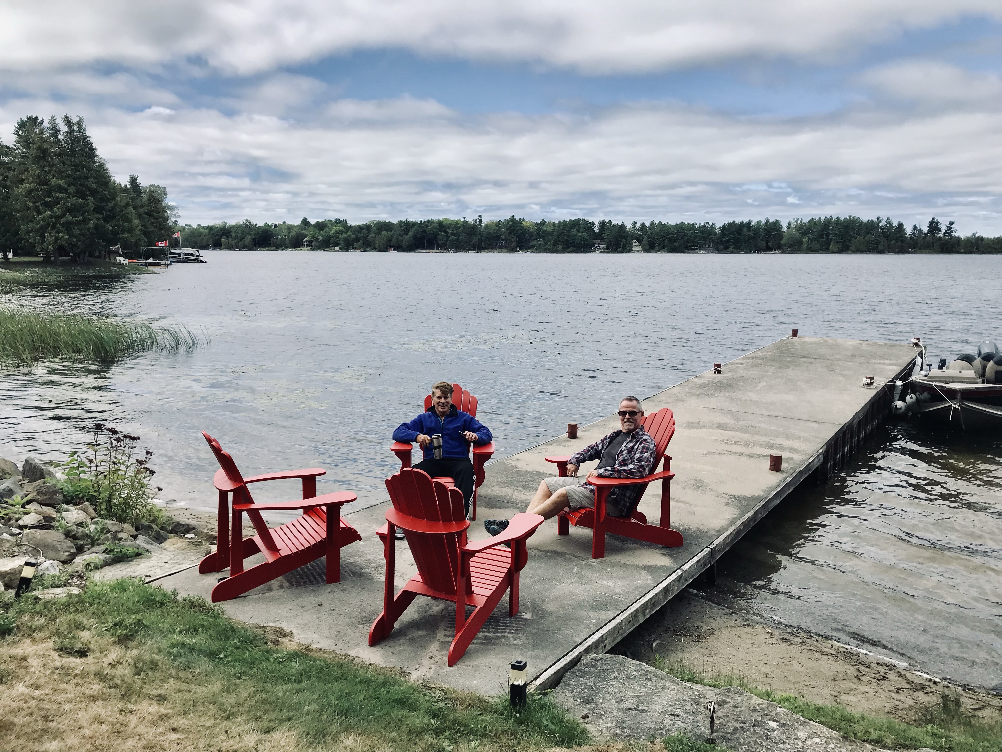 After far too short a visit, we said our goodbyes and headed back west and north to reconnect with my cousin Tony and family at their cottage on the edge of Algonquin Park on Oxtongue Lake. Its a good thing they weren’t sick of us after rescuing us when Klara broke down, lucky us. Their place is perfect for their large family and given that their girls were not up for the weekend, they had room for us. Their location is idyllic, low bank waterfront on a beautiful quiet lake and with all the toys, boat, canoes, kayaks, and of course red Adirondack chairs lining the lakeside. We stayed two nights and they took us for the quintessential Algonquin experience, canoeing up the Oxtongue River to the base of the waterfall. We climbed up the side of the waterfall and enjoyed some snacks, something we like to do whenever we hike. Judy had some work to do, so it was Heidi and five guys, she was in her element. Art even took the dare and along with Andrew jumped from the rope swing by the side of the river as we made our way back.