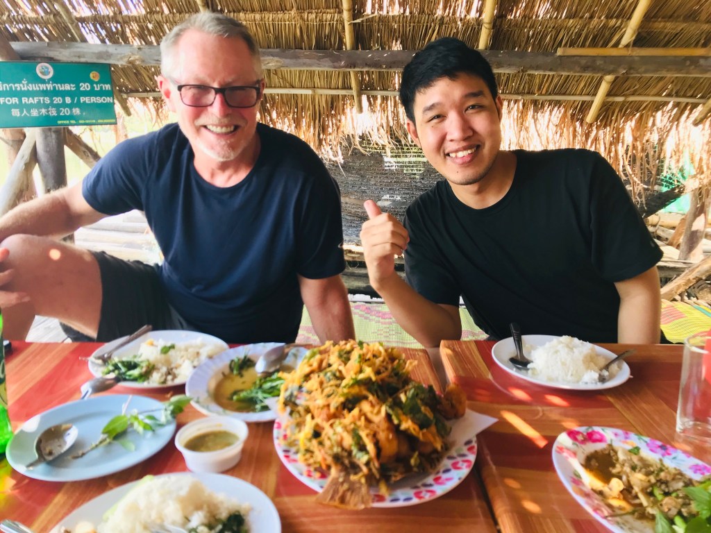 After the waterfalls we visited a popular lake that has small huts on stilts serving as the tables for local restaurants. You rent the hut for $1.00 per person and then pay for food. We spent 2-3 hours relaxing and eating a sumptuous Thai feast of chili and herb crusted fish, larb, which is the Thai equivalent of lettuce wrap, as well as garlic and chili sautéed morning-glories, which are a cross between Chinese broccoli and spinach. All this food including rice, drinks and tip was a whopping $20.00 for three people.