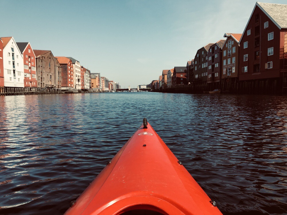 We kayaked at Trondheim on the Nidelva River that took us through the beautiful countryside. We entered the river 2 hours east of the port and we paddled past the 11th century cathedral and through the old town with the colorful riverside buildings and even saw a Viking rowboat to complete the experience.